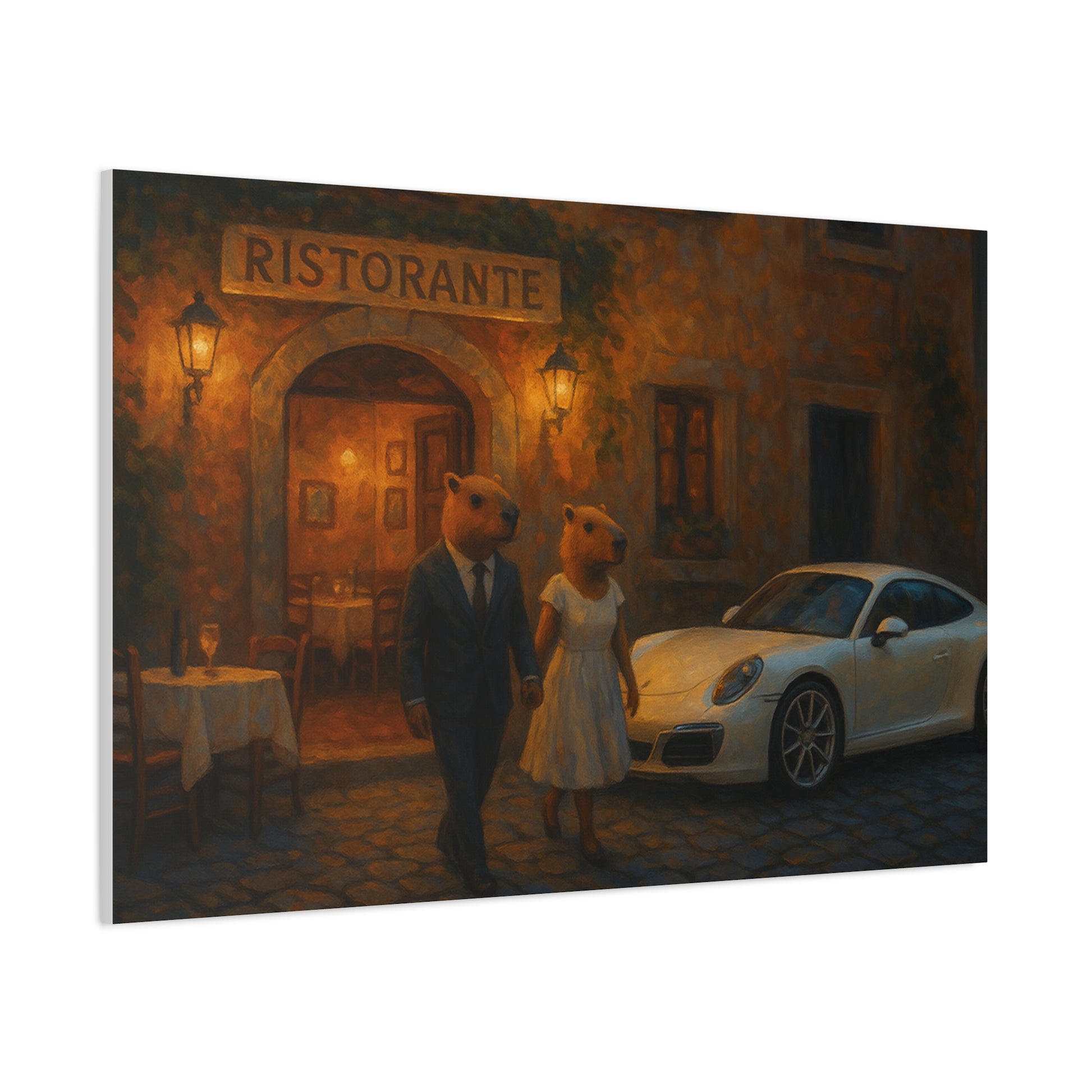 Step into a warm European evening with Capybara Date Night, a stunning matte canvas that captures the charm of romance, elegance, and whimsy all in one frame.
